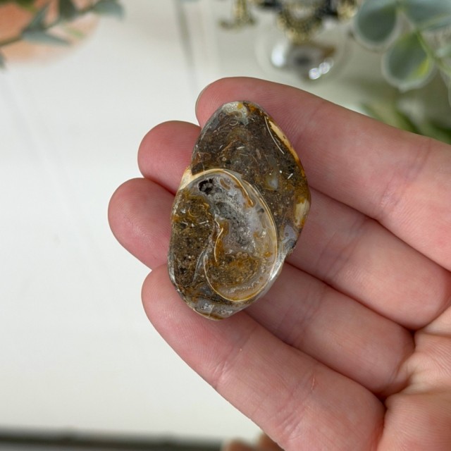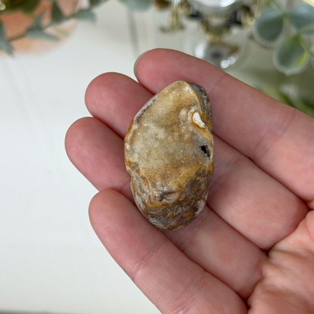 Geologisk sett er dette en kombinasjon av fossilt materiale og sekundær mineralisering, ofte med kvarts eller kalsedon som krystalliserer inne i strukturen. Det betyr at du bokstavelig talt holder både historie og krystall i hånden.