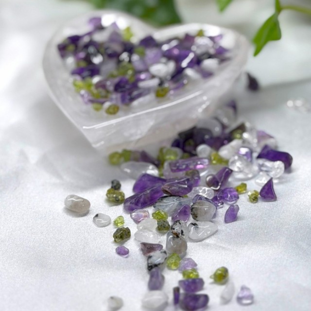 Enchanted Floris er en harmonisk krystallmix med en vakker balanse mellom lilla og grønne toner, kombinert med lyse og glødende detaljer. Denne miksen gir et friskt og lett uttrykk, perfekt for deg som ønsker å skape en rolig, men samtidig levende atmosfære rundt deg.