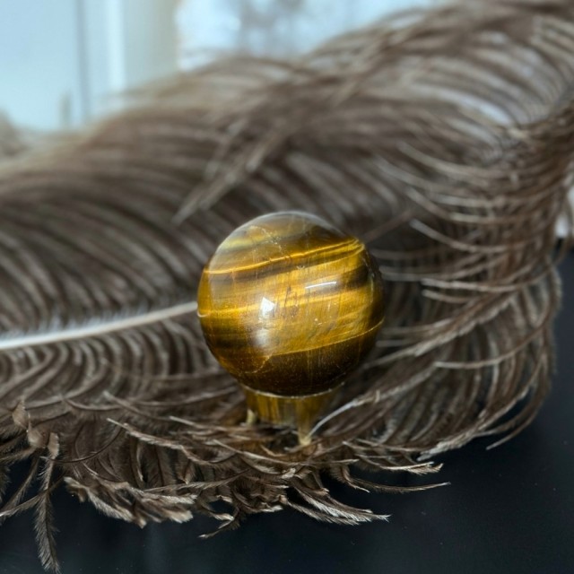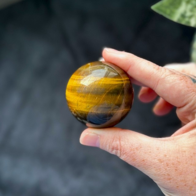 En nydelig liten gullskinnende Tigerøye kule på 4,7cm og ca. 149g - et glødende symbol på styrke, mot og selvsikkerhet. Med sitt hypnotiske skinn beskytter den mot negativitet, balanserer energi og bringer et snev av ren solmagi inn i ditt hjem.