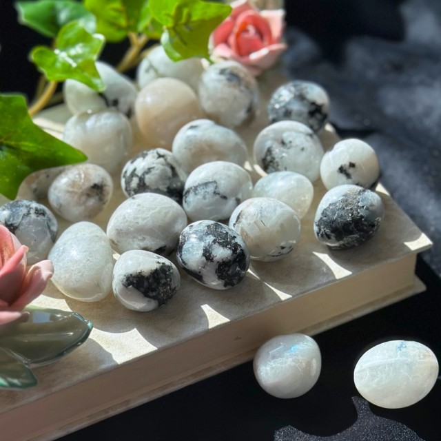Regnbue Månestein (også kjent som hvit labradoritt) er en favoritt blant samlere – elsket for sitt blå glimt, iriserende skinn og sterke tilknytning til månesykluser og indre visdom. Disse er ca 2-3cm. Alle har flash-garanti, tilfeldig hvor mye.