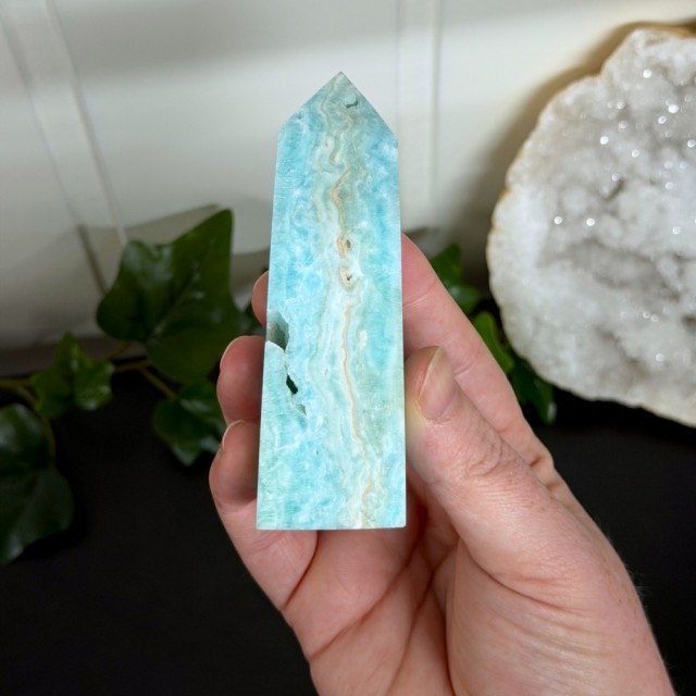 Blå Aragonitt er en beroligende stein som minner om stillheten i havet. Den lindrer stress, styrker kommunikasjon og bringer fred, klarhet og egenkjærlighet. Dette tårnet er 123g og 9,6cm.