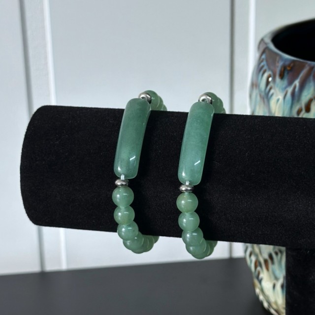 Grønn Aventurin er en type kvarts preget av sin melkeaktige, ugjennomsiktige tekstur og glitrende overflate -skapt av små inneslutninger av fuchitt, et glimmermineral som gir den dens naturlige grønnfarge. Steinen finnes i nyanser fra myk salvie til dyp smaragdgrønn, og fargen varierer avhengig av hvor i verden den er hentet fra.