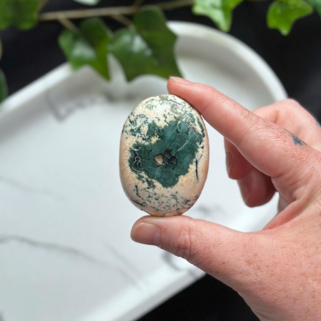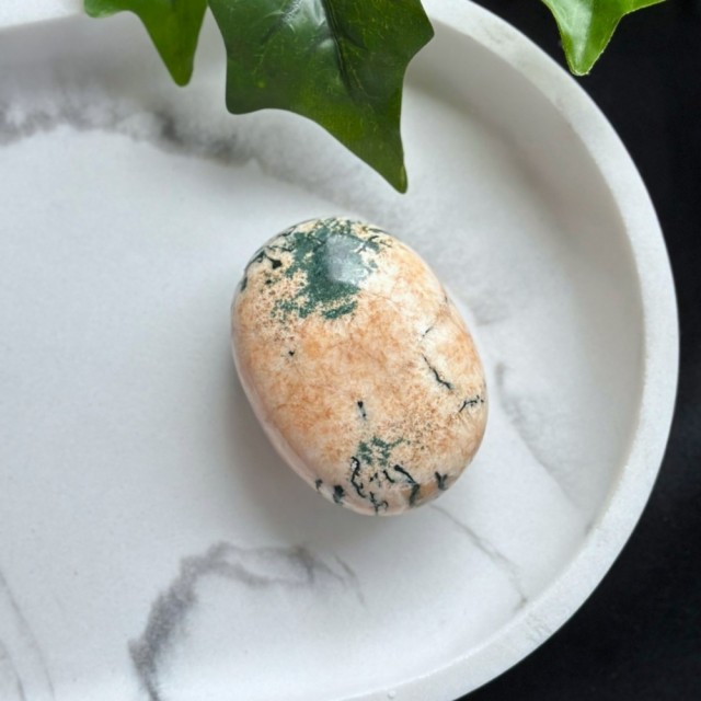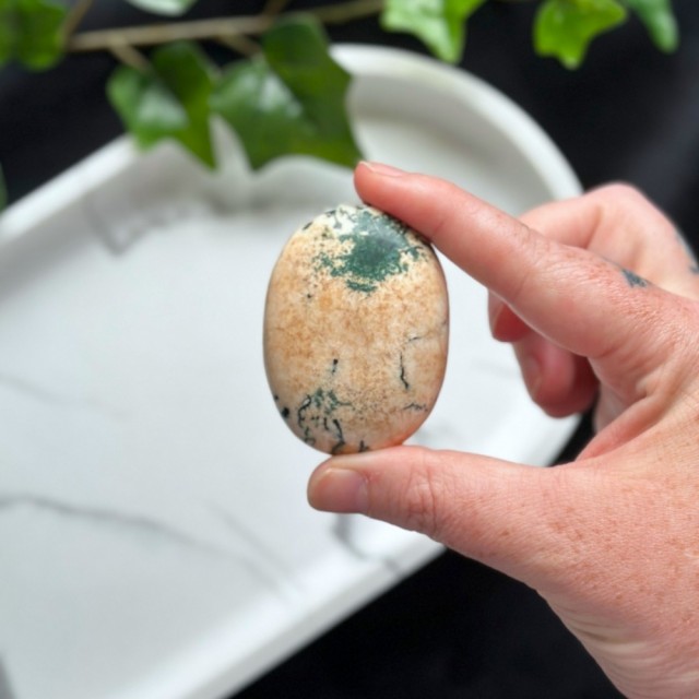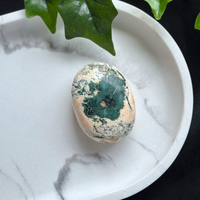 -Tre Agat, en jordnær form for grønnlig hvit agat, med mønstre som minner om moser eller røtter - derav navnet.