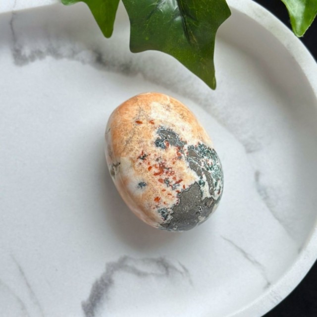 En unik krystallkombinasjon som bringer lys, ro og jording. Heulanditt, Skolesitt & Tre Agat jobber sammen for dyp healing og spirituell støtte. Denne er ca 75g og 6,2cm. OBS: Naturlige merker, groper og cracks forekommer.