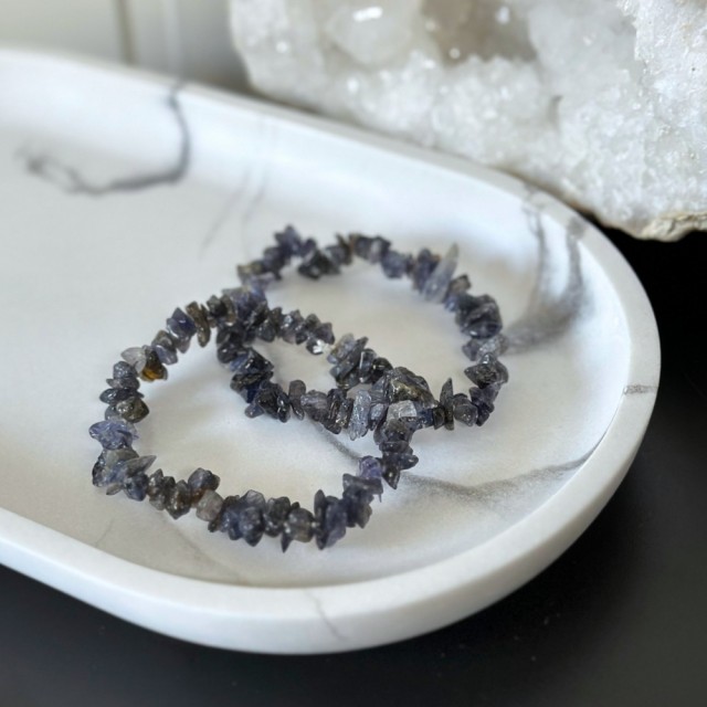 Iolitt er en variant av mineralet Cordieritt. Den er rik på jern og kommer i nyanser av lilla og grå eller kan være fargeløs. Den har en glassaktig glans og et gjennomsiktig utseende. Iolite er svært slitesterk og viser forskjellige farger når den ses fra forskjellige vinkler. Iolite utstråler klar kommunikasjon og kosmiske forbindelser.