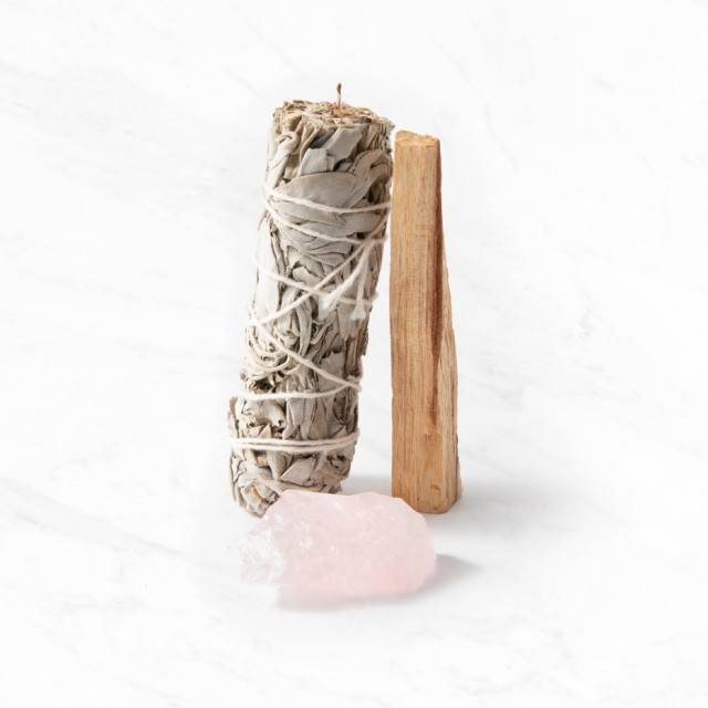Inneholder hvit salvie bunt, palo santo pinne (ca 8-9cm), rosenkvarts og ritualhefte.