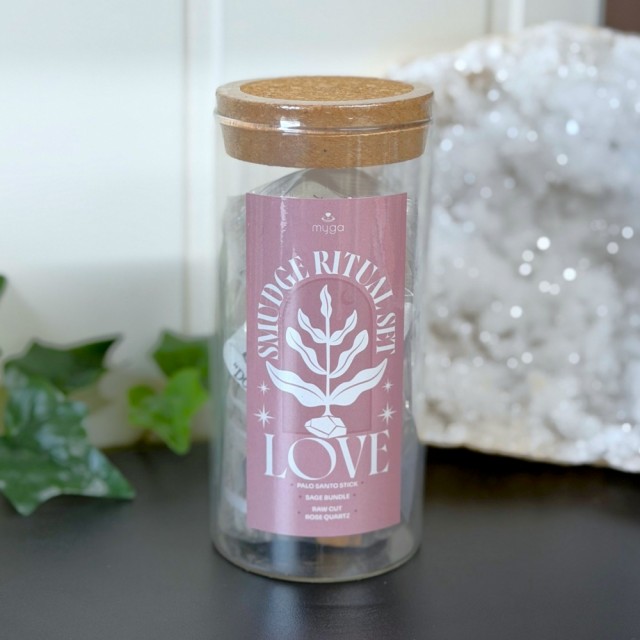 Dette settet er en hyllest til alt som er varmt, vakkert og nært. Rosenkvarts er hjertets egen stein og arbeider med emosjonell healing, selvkjærlighet og åpne, milde vibrasjoner. Sammen med rensende hvit salvie og den sødmefulle energien til Palo Santo skaper settet en atmosfære der kjærlighet får blomstre, både innover og utover.