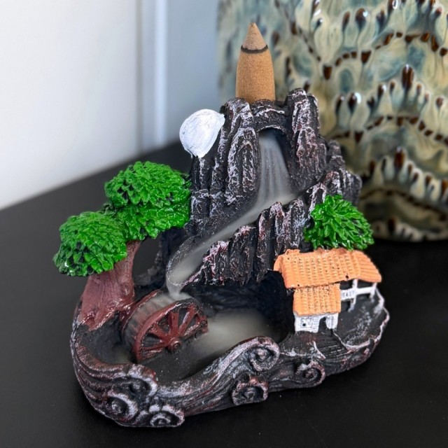 Denne varianten av Mistfall føles mer som et lite landskap enn bare en røkelsesholder. Et lite hus, et tre og en foss som binder det hele sammen.