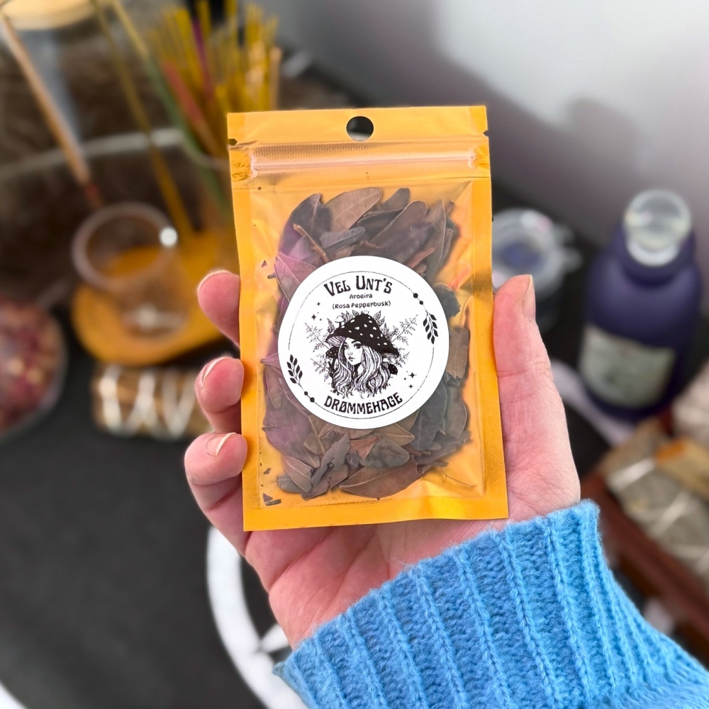 Denne aroeiraen stammer fra nøye utvalgte partier dyrket i Portugal. Plantematerialet er høstet og tørket med respekt for plantens syklus, og bærer med seg en varm, jordende og lett krydret energi - ideell for rituelt arbeid der beskyttelse og balanse står i fokus.
