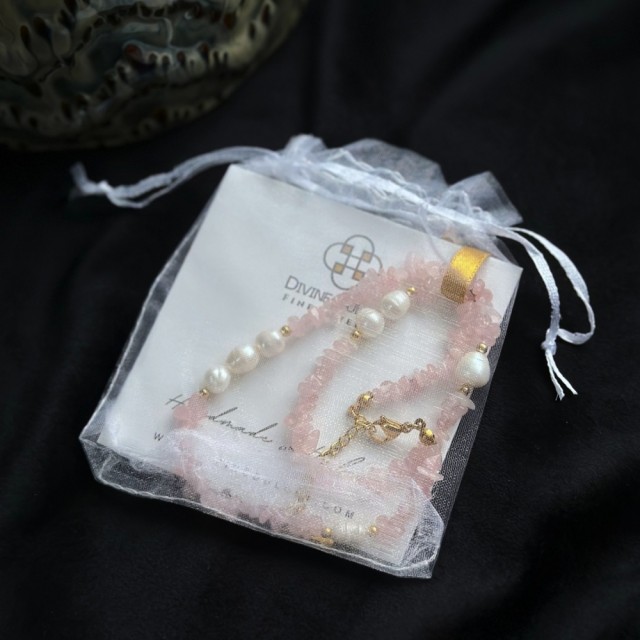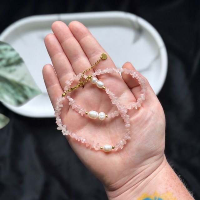 Super elegant halskjede laget med naturlige rosenkvartskrystallbiter og naturlige ferskvannsperler. Dette rosenkvarts-chokeret er den perfekte kombinasjonen av eleganse uten å forsømme naturlige krystaller med spirituelle helbredende krefter. Kjedet er laget av 24 karat gullbelagt rustfritt stål, noe som gjør det motstandsdyktig, hypoallergenisk (vennlig mot sensitiv hud) og vannvennlig. Du vil ikke ha problemer med fargeendring eller misfarging, i tillegg til at det er nikkelfritt.