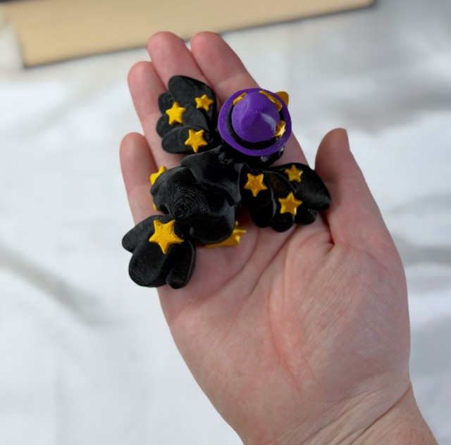 Midnight Witch Crow er en fleksibel 3D-printet kråke tryllet frem hos Vel Unt. Den bærer en lilla heksehatt pyntet med gylne stjerner og et blikk som glitrer av nattens hemmeligheter.
