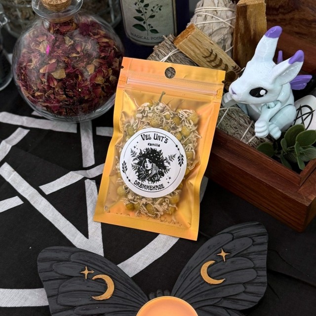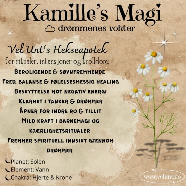 For et drømmeritual: Fyll en liten pose med kamille, lavendel og en liten ametyst. Legg den under puten, tenn et lys før du legger deg og sett en intensjon om å motta budskap i drømmene dine. Kamille er også perfekt å bruke i velstandsspell - dryss litt på alteret sammen med mynter og grønn aventurin.