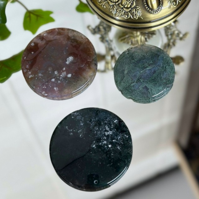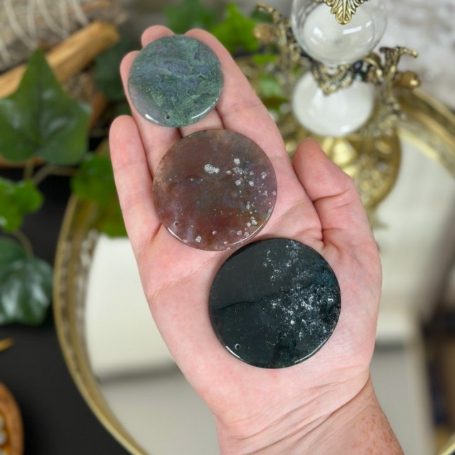 Pakke med 3 stk runde Mose Agat skiver med hull - perfekte til smykkelaging, kreativt håndverk eller som små talismaner. Mose Agat bringer jordende energi, vekst og naturens ro. **OBS små merker/hakk forekommer.