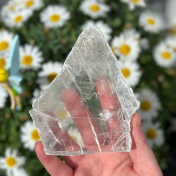 Selenitt er en utrolig skjør krystall og kommer som regel med små merker på seg fra frakt. Den er faktisk så delikat at så mye at selv en negl kan få steinen til å få riper. Denne er 14cm høy og veier ca 271g.
