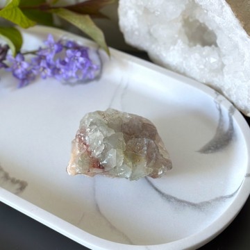 En blomstrende oase av kjærlighet, klarhet og indre ro. Rosenkvarts åpner hjertet, Regnbue Fluoritt styrker intuisjonen, og Bånd Ametyst bringer balanse og harmoni. Sammen skaper de et energirikt smykke for hjem og sjel. Små merker/hakk forekommer.