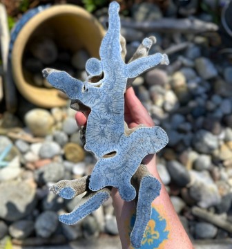 Blå Aragonitt er en beroligende stein som minner om stillheten i havet. Den lindrer stress, styrker kommunikasjon og bringer fred, klarhet og egenkjærlighet. Dette tårnet er 123g og 9,6cm.