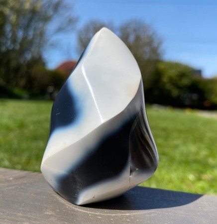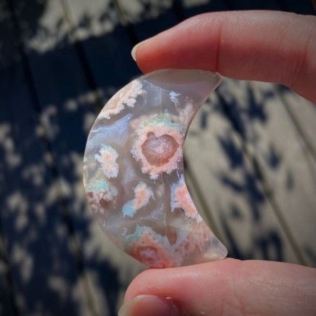 Gjennomskinnelighet, fargemønstre eller moselignende inneslutninger kan skille denne steinen fra andre former for Kalsedon.