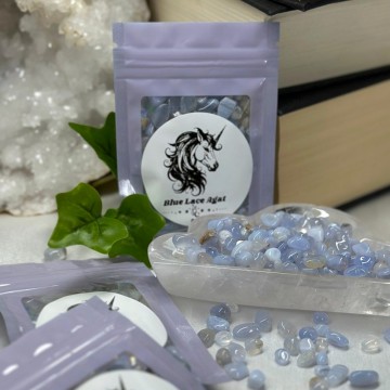 Naturlig Blue Lace Agat/Blonde Agat krystallchips i 30 gram poser. Disse kan brukes til dekorasjon i hjemmet eller i hekse-spells.
