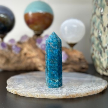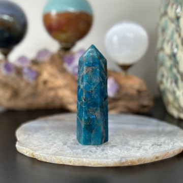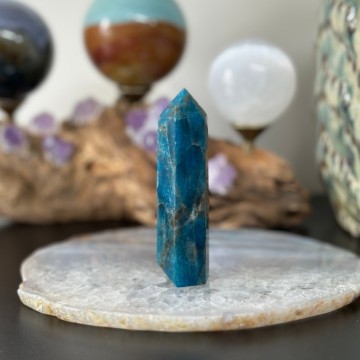 Nydelig Blå Apatitt tårn. Dette er 8,1cm høyt og veier ca 85g. Det er den krystallen du ser på bildene du får hvis du bestiller denne. OBS: Står litt skeivt men vises bare i noen retninger.