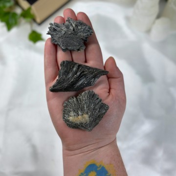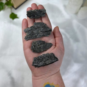 Svart Kyanitt råflak. OBS: Disse er tynne og skjøre. Kan splintre lett, vær forsiktig. Prisen er per stk. Størrelse vil variere, da disse selges vekt vis.