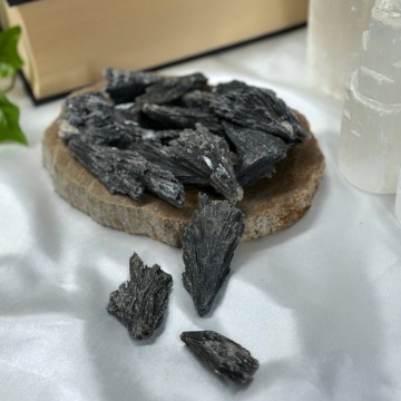 Svart Kyanitt råflak. OBS: Disse er tynne og skjøre. Kan splintre lett, vær forsiktig. Prisen er per stk. Størrelse vil variere, da disse selges vekt vis. Selges enkeltvis men kan forekomme 2 stk i en pakke hvis vekten blir for liten med en stk.