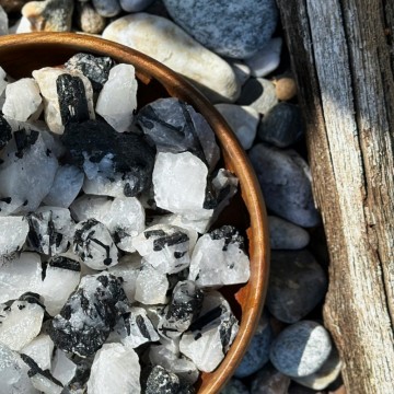Turmalinkvarts/Turmalinert Kvarts råsteiner - mini størrelse. Disse veier ca 10-23g og er ca 2-3cm. Prisen er per stk. Hvor mye Svart Turmalin som forekommer på kvartsbiten du kjøper er helt tilfeldig.