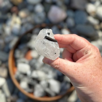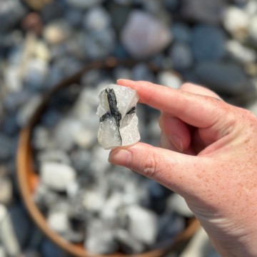 Turmalinkvarts/Turmalinert Kvarts råsteiner. Disse er størrelse små, dvs 25-35g og ca 3-4,5cm. Prisen er per stk. Hvor mye Svart Turmalin som forekommer på kvartsbiten du kjøper er helt tilfeldig.
