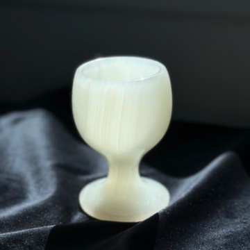Lys Bånd Kalsitt, ofte referert til som Grønn Onyx/Båndet Grønn Onyx (men den er ikke en Onyx). Dette begeret er 7,9cm høyt og veier ca 191g.