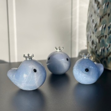 Kjempe søte blå Kalsitt prinsesse hval. Disse kan brukes som dekorasjon slik dem er eller du kan bruke dem som kuleholder. Disse er ca 4cm høye. Tilfeldig plukket - størrelse varierer.