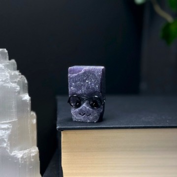 Liten hodeskalle utskåret i Obsidian. En mørk og mystisk beskytterstein, perfekt som alterpynt, lommestein eller samlerobjekt. Disse er ca 2cm lange.