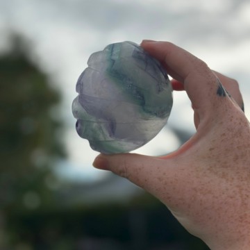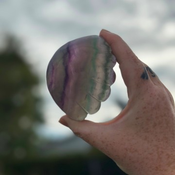 En stjerne av Regnbue Fluoritt som minner deg om å følge din egen vei. Naturens farger danser i lyset og bringer ro, balanse og mental klarhet til rommet. Høyde med stand: ca 19cm - uten stand: 12,7x8,3x1,8cm. Vekt: 118g.