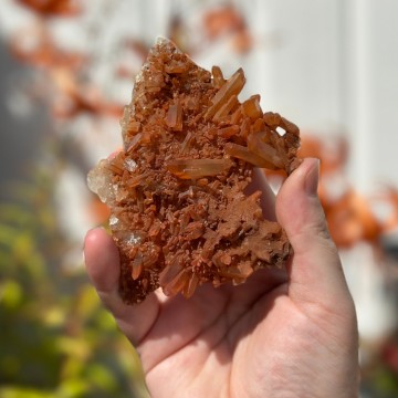 Nydelig flat Mandarinkvarts (Tangerinekvarts) gruppe. Denne veier ca 102g og er ca 9,8x8,2x1,6cm. Det er den krystallen på bildene du får hvis du bestiller denne. OBS: Små biter kan falle av i frakt.