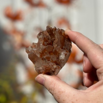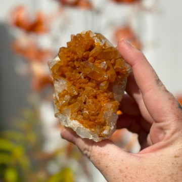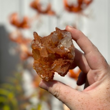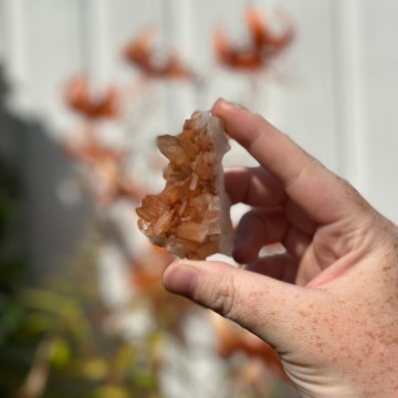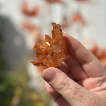 Nydelig Mandarinkvarts (Tangerinekvarts) gruppe på 84g og 5,7x4,9x3,3cm. Det er den krystallen på bildene du får hvis du bestiller denne. OBS: Små biter kan falle av i frakt.