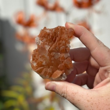Nydelig liten flat Mandarinkvarts (Tangerinekvarts) gruppe på 38g og er 6,5x3,7x1,5cm. Det er den krystallen på bildene du får hvis du bestiller denne. OBS: Små biter kan falle av i frakt.