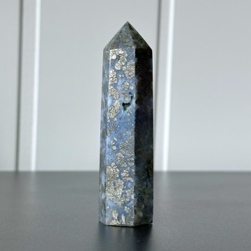 Blå Aragonitt er en beroligende stein som minner om stillheten i havet. Den lindrer stress, styrker kommunikasjon og bringer fred, klarhet og egenkjærlighet. Dette tårnet er 101g og er 9,5cm høyt.