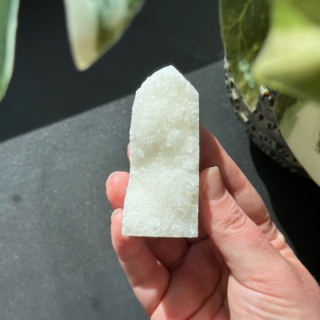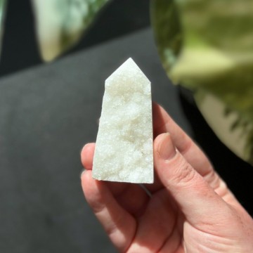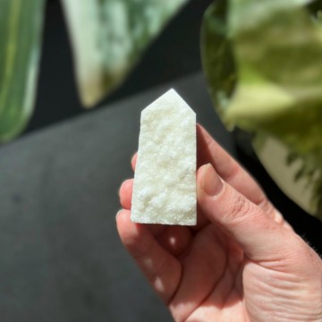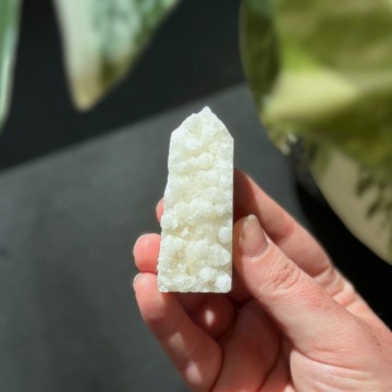 Blå Aragonitt er en beroligende stein som minner om stillheten i havet. Den lindrer stress, styrker kommunikasjon og bringer fred, klarhet og egenkjærlighet. Dette tårnet er 109g og 8,5cm høyt.