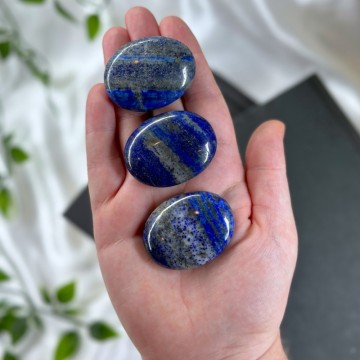 Små Lapis Lazuli håndsteiner. Disse veier 41g og har ca mål på 4,5x3,5x1,5cm. Tilfeldig plukket.
