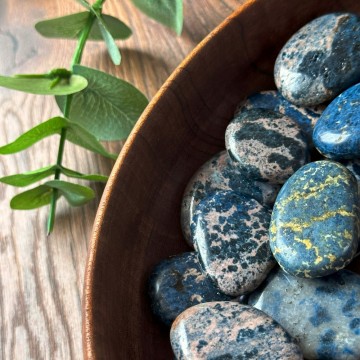 Vakker Dumortieritt lommestein, ca. 4-4,5cm lang og 1-1,5cm tykk. Hver stein er unik - blå med innslag av gule eller grå toner. Perfekt for deg som søker fokus, tålmodighet og indre ro. Størrelse og farge velges tilfeldig. Små naturlige merker forekommer.