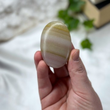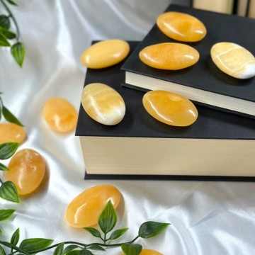 Nydelige små Oransje Bånd Kalsitt håndsteiner. Disse har en vekt på ca 36-49g og har ca mål 5,3x3,4x1,5cm. OBS: Små merker kan forekomme.