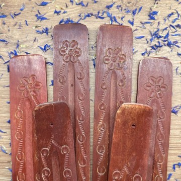 Røkelseholder til røkelsepinner med inngravert blomster mønster i seg. Disse er ca 26-27cm lange. Farge og størrelse vil variere da ingen av røkelseholderene er indentiske.