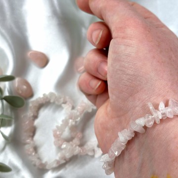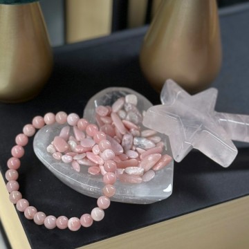Et kjærlighetssett for hjertet, sjelen og den myke styrken i deg. Dette vakre Rosenkvarts settet inneholder et chips armbånd, et mini hjerte og en liten tromlet stein -perfekt for deg som søker indre ro, egenkjærlighet og harmoniske forbindelser.