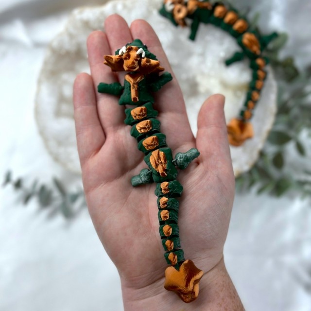 3D Printet Green Empire Ocean Drage på 18cm lengde. Denne fargekombinasjonen er grønt, hvitt og mørkegrønt. Disse kan brukes som dekorasjon i hyller, bord eller om du bare ønsker en liten venn du kan leke med!