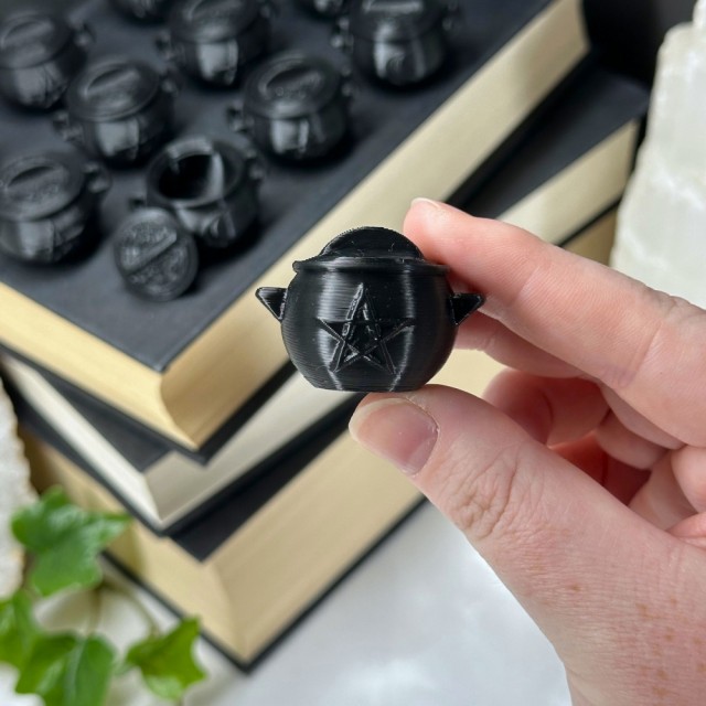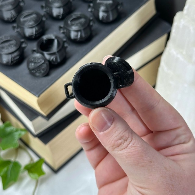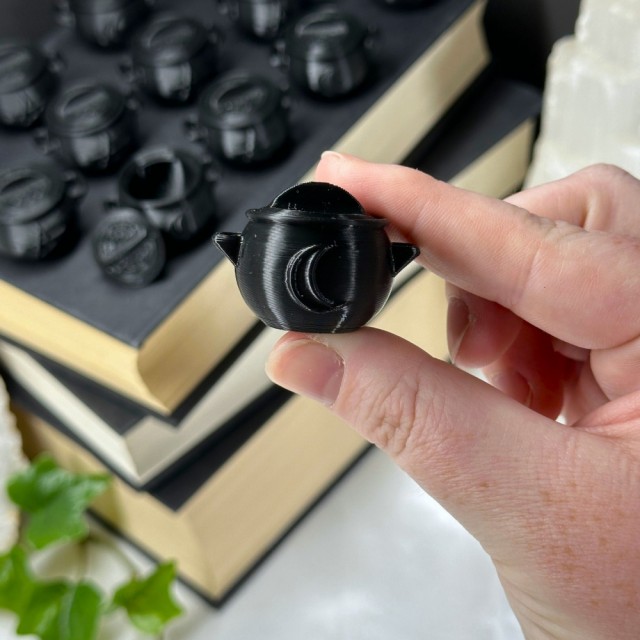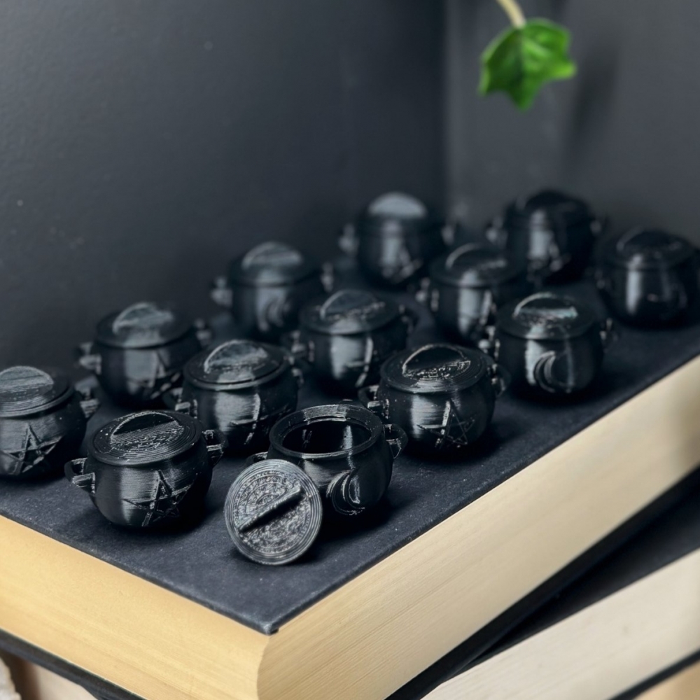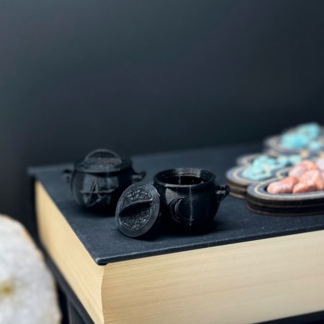 Gjør alterbordet ditt enda mer magisk med disse mini tryllegrytene som er markert med måne symbol og pentagram. Disse søte små kan oppbevare en liten slump med urter, små krystallchips m.m.
