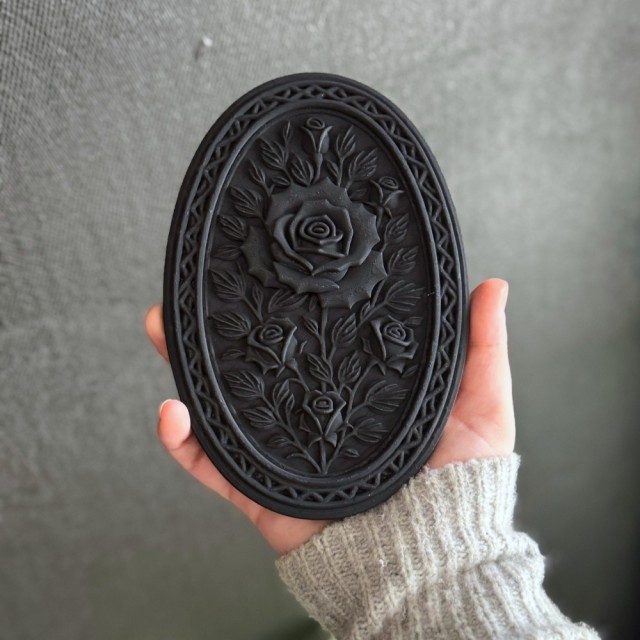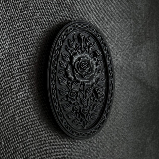 Den detaljerte rosen trer frem fra bakgrunnen omgitt av blader og ornamentert kant, som en klassisk cameo hentet fra en gammel herskapsbolig. Den matte sorte finishen gir et sofistikert og dramatisk uttrykk uten å bli overveldende.