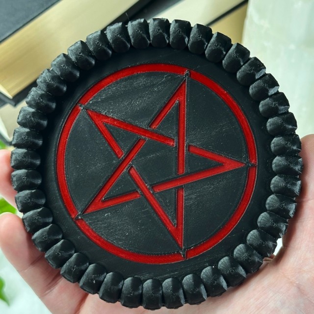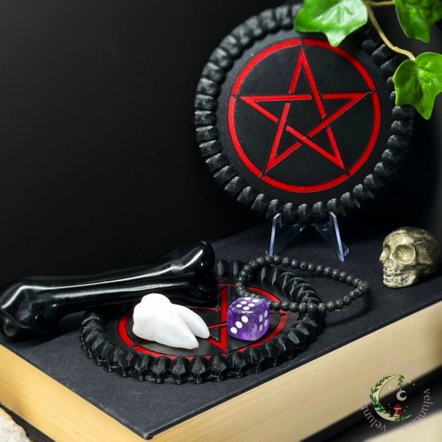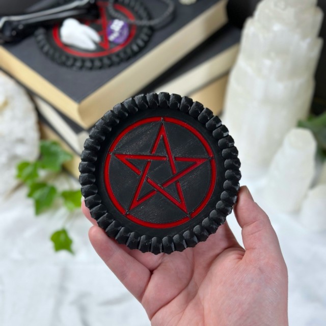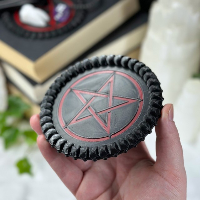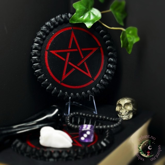 Skap mystikk i hjemmet ditt med disse råtøffe pentagram oppbevaringsfatene. Kanten rundt fatet er små svarte dødninghoder.