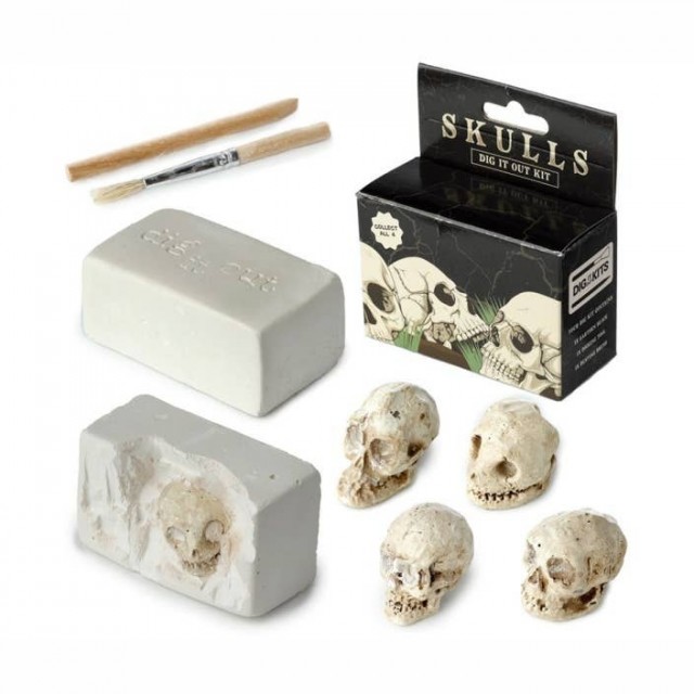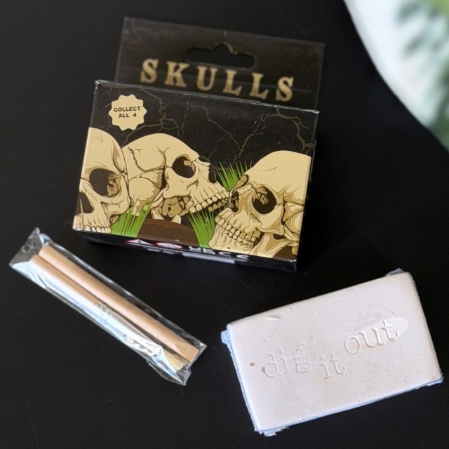 Dette mini “dig it out” settet lar deg grave frem din egen lille hodeskalle, akkurat som en ekte arkeolog. Inni blokken skjuler det seg en overraskelse som sakte kommer frem jo mer du jobber med den.