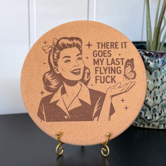 Aggressive Gryteunderlag - “There it goes, my last flying fuck.” For deg som har nådd grensa og gir fullstendig slipp. 20x20cm i varmebestandig kork som beskytter bordet mot varme og søl, med ærlig og ufiltrert humor.