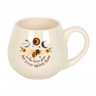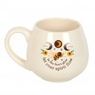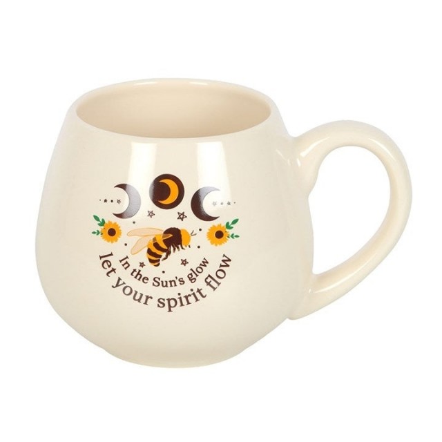 Feir magien til sommersolverv med dette avrundede keramiske kruset, utsmykket med den oppløftende setningen "I solens glød, la ånden din flyte". Med et vakkert design av bie, solsikke og månefase, er dette kruset perfekt for å omfavne sesongens strålende energi med hver slurk.