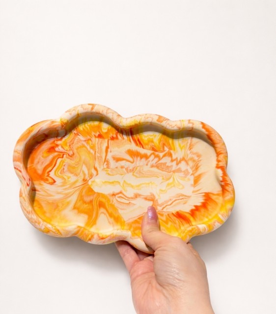 Dette skyformede fatet er for deg som vil ha noe litt mer levende, varmt og unikt i hjemmet ditt. De myke bølgende formene kombinert med marmorerte toner av oransje, gul og beige skaper et uttrykk som både er rolig og fullt av personlighet.