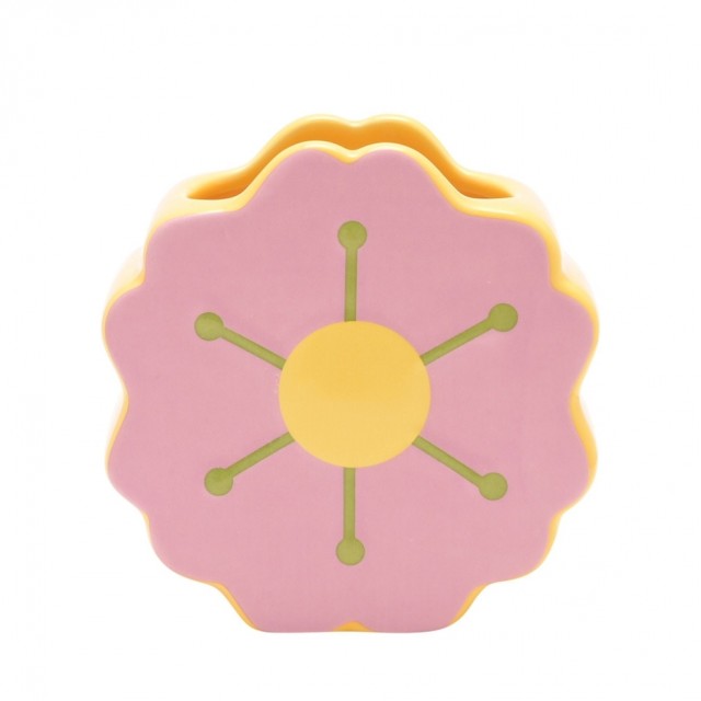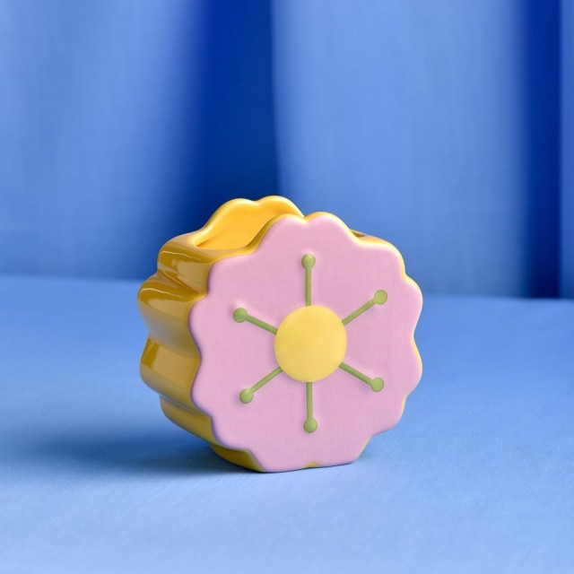 Denne er kjærlig designet i samarbeid med Raspberry Blossom. Dristighet og glede er hva dette fargerike merket handler om. Laget av keramikk med en glasert finish og med fargene gul, lilla og grønn, er denne vasen en fantastisk visuell skatt.